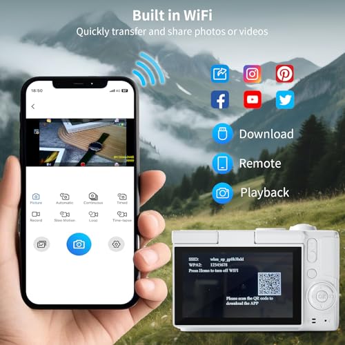 WiFi and Bluetooth: The WiFi digital camera 4K is equipped with high-speed WiFi and Bluetooth 5.0 modules, best vlogging camera 4K video camera for vlogging. Connect your smart device with just one click to transfer high-resolution photos or videos to your phone, tablet or computer. The Content Creator Camera 4K Ultra HD camera instantly shares on social media platforms without the need for a data cable. 4K camera for video recording camera for YouTube. Easy to use the composition.