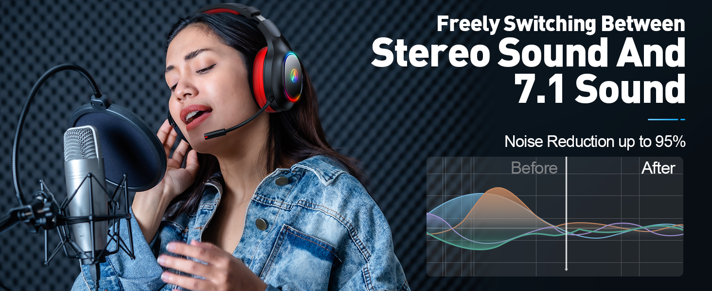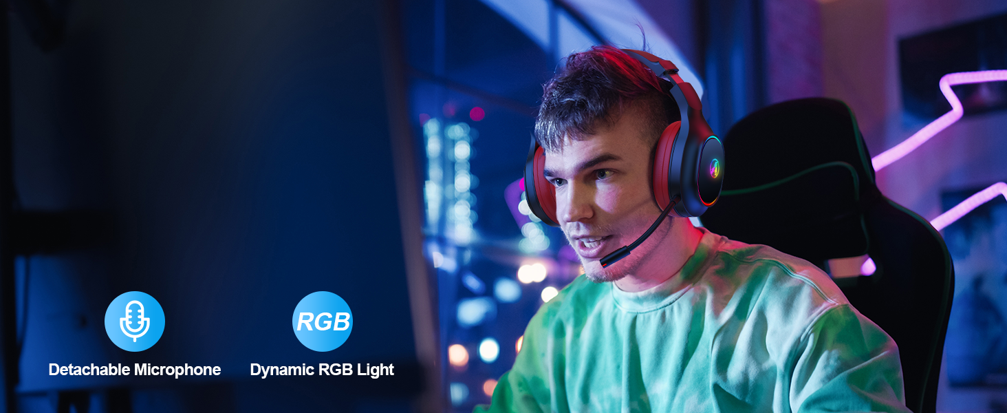 - Detachable Noise Cancelling Microphone & Cool RGB Lights:To enhance your gaming experience, our wireless gaming headset features a detachable noise cancelling microphone and eye-catching RGB lighting design. You can easily disconnect the microphone when you don't need it to ensure more comfortable use. At the same time, advanced noise reduction technology effectively eliminates up to 95% of ambient noise.
