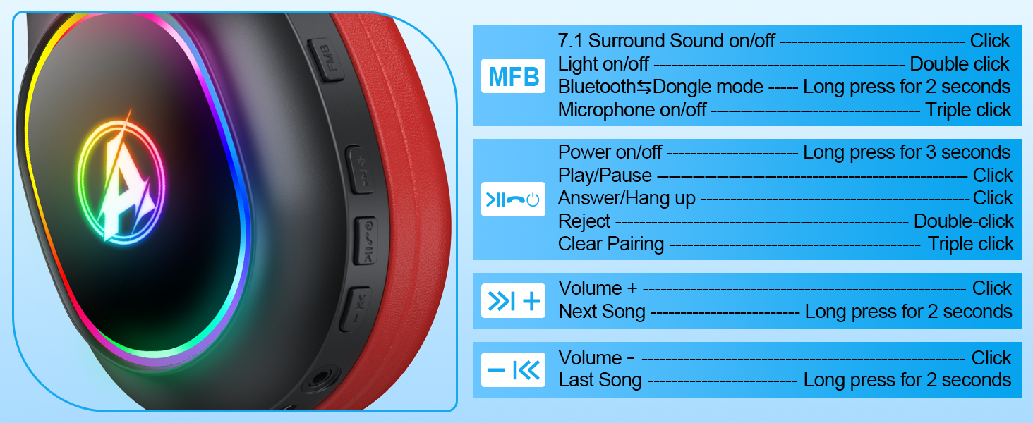 - ️Note: In wired mode, the gaming headset is plug and play. ️The headset is turned off, the buttons do not work and the RGB lighting is not available. Volume control and playback control are controlled via your device