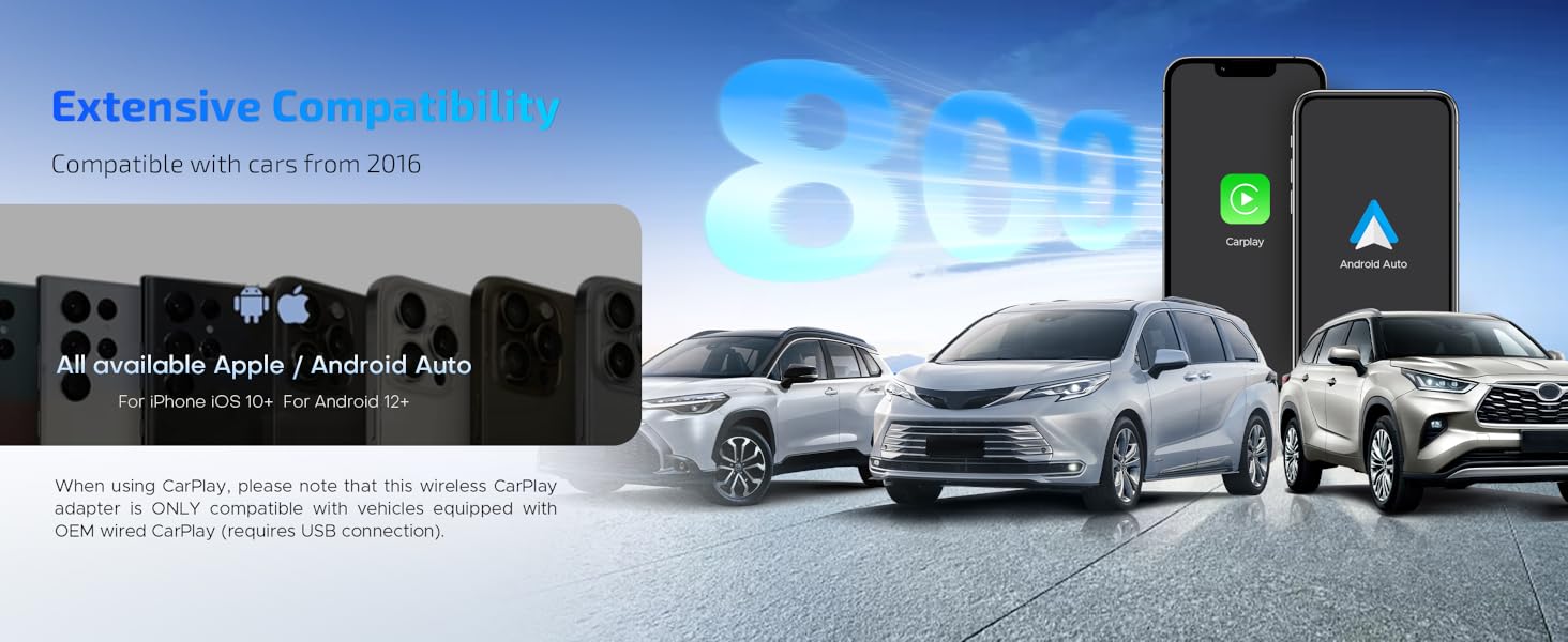 [Exceptional Connectivity Experience] The 2026 2-in-1 Wireless CarPlay and Android Auto adapter is equipped with a powerful dual-core CPU, V5.3 Bluetooth, and 5.8GHz Wi-Fi, ensuring efficient and stable audio and video transmission. Users can easily enjoy seamless navigation, music playback, and voice assistant features, making it feel like having a second smartphone in the car, enhancing the experience of every drive. Additionally, the wireless Android Auto car adapter is compatible with iPhone 6 and later models (running iOS 10 or higher) as well as Android 12 and above, catering to a wide range of users.