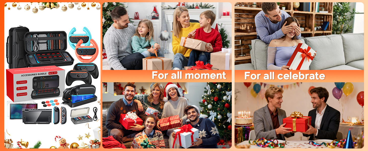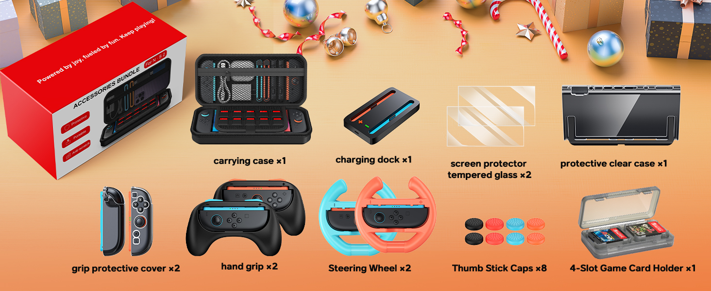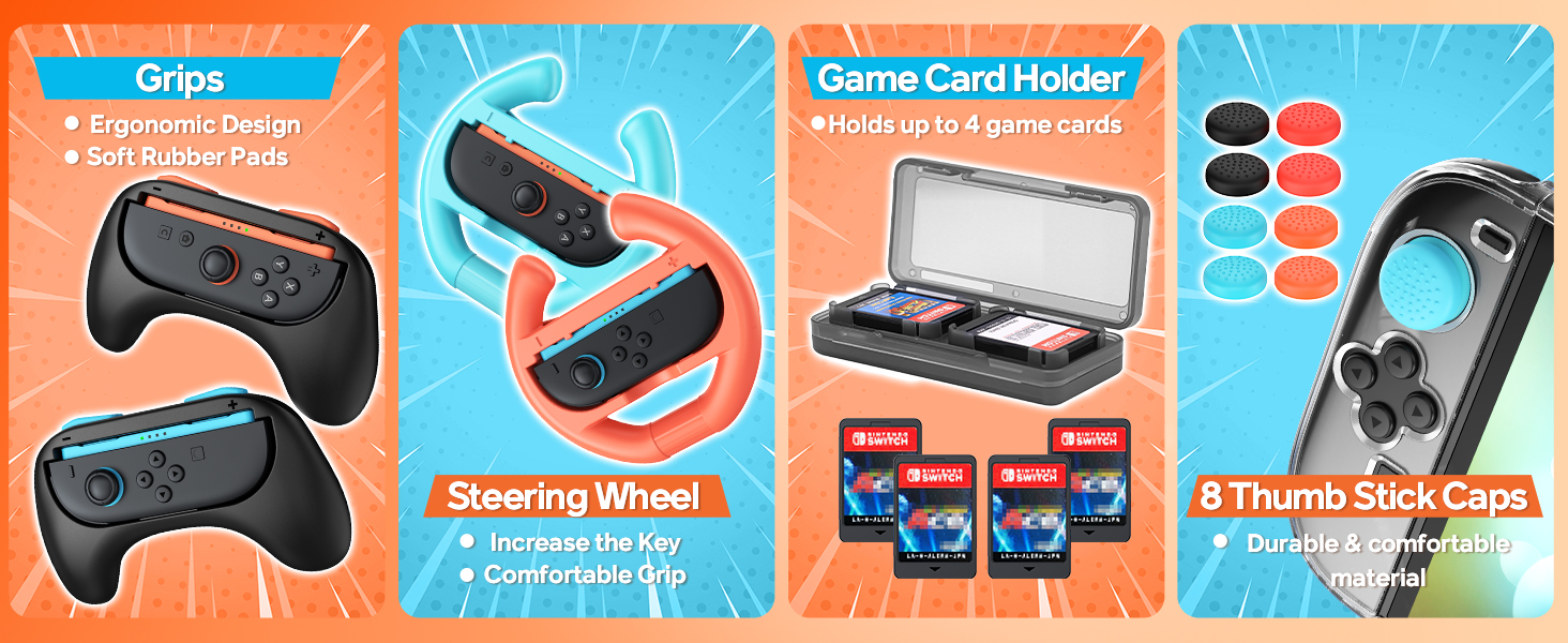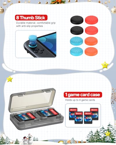 - Game Accessory Supplement: Textured joystick grips offer a secure, non-slip hold for better control and comfort. The adjustable gaming stand lets you play while charging, with a customization angle for the ideal viewing position. The game card holder stores up to 23 game cards and 2 SD cards, keeping accessories organized and easily accessible