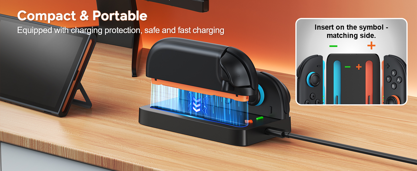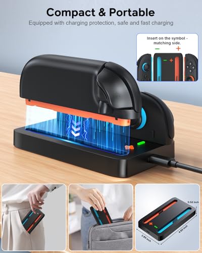 - Magnetic LED Charger Dock: This charging dock for Switch 2025 allows you to charge up to 4 controllers simultaneously with magnetic alignment, no need to worry about the +/- direction of controller. Its compact design keeps your controllers organized and easily accessible, ensuring a neat and clutter-free gaming space