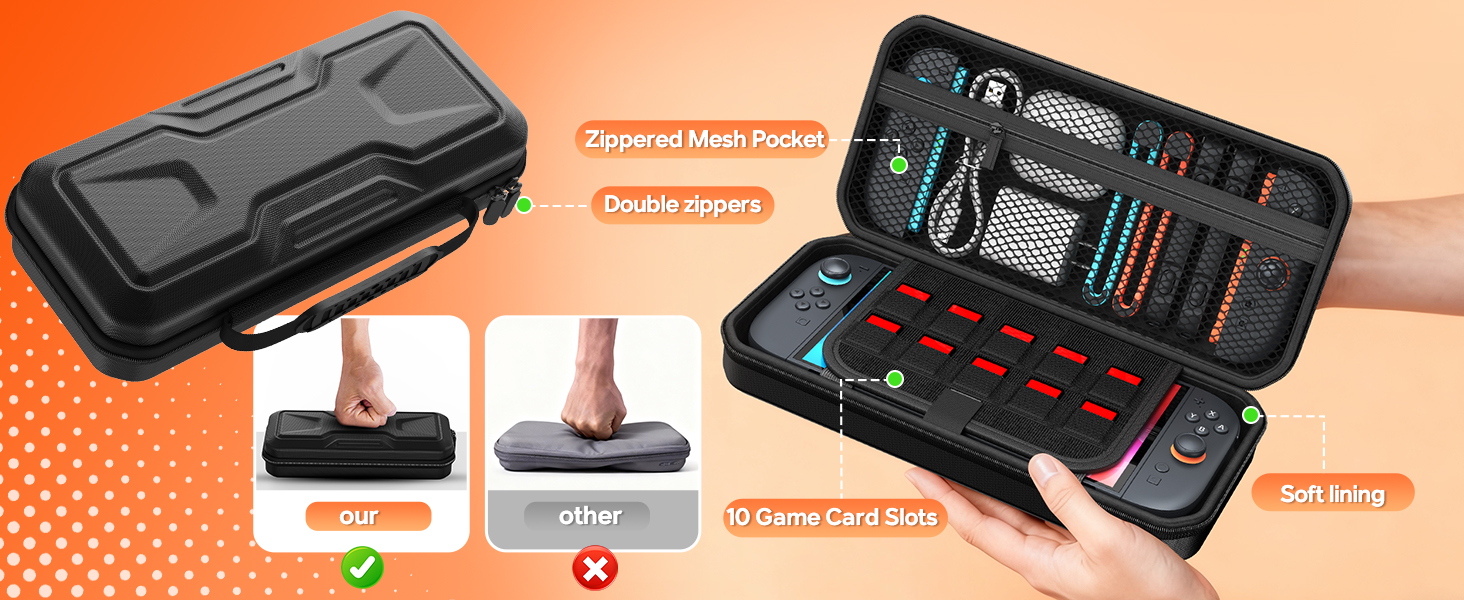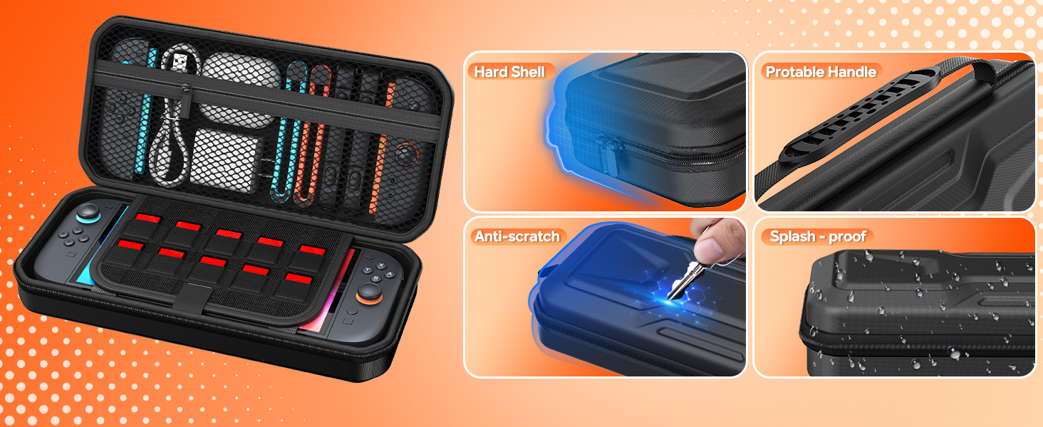 - Charge Inside Case: The carrying case for Switch 2 combines practicality and protection. With a pass-through charging port, you can charge your console without removing it. The durable EVA hard shell and soft interior safeguard your console from drops, scratches, water damage, and shaking. A mesh zipper pocket securely stores cables and small accessories, keeping everything organized and protected while traveling
