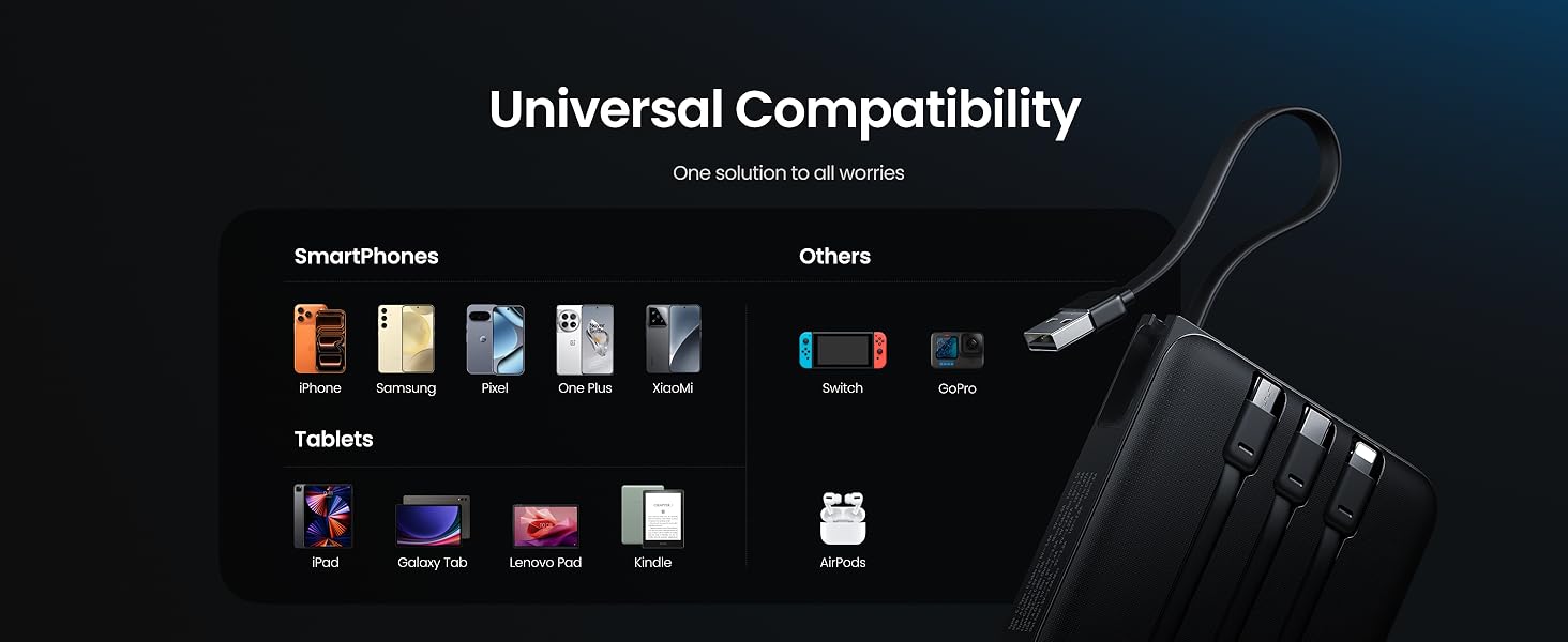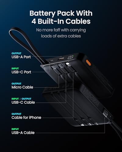- [Diverse Built-in Cords for Wide Compatibility] This power bank comes with 4 built-in cables(cable for iPhone+USB C+USB A+Micro) and 2 ports(USB C+USB A) which fit most mobile electric devices on the market,including common used smart phones, Bluetooth headphones and tablets, such as iPhone, iPad, Samsung, Xiaomi, etc.