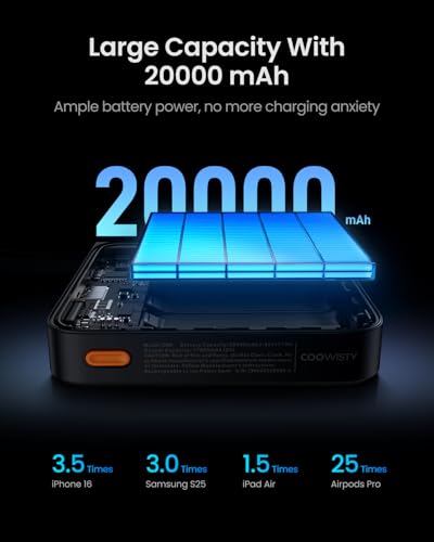 - [Massive 20000mAh Capacity] Coowisty phone power bank with 20000mAh capacity could fully charge your iPhone 16 up to 3.5 times, Samsung Galaxy S25 up to 3 times or Air Pods Pro up to 25 times. Sufficient power capacity of this phone charger power bank could help you get rid of battery anxiety during travel or outings.