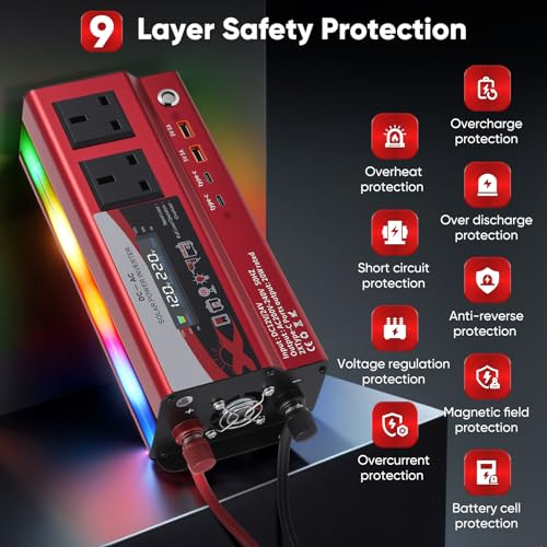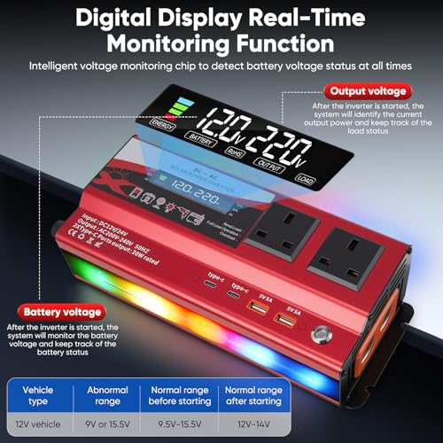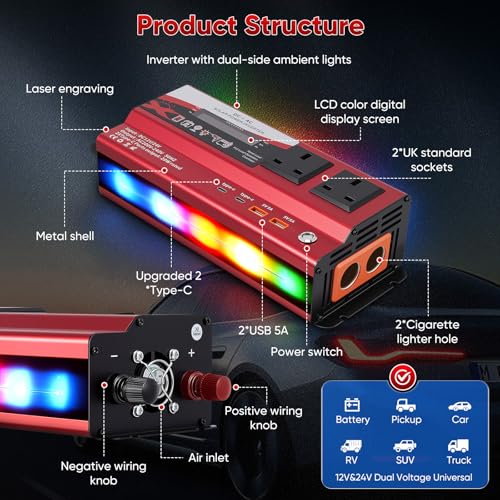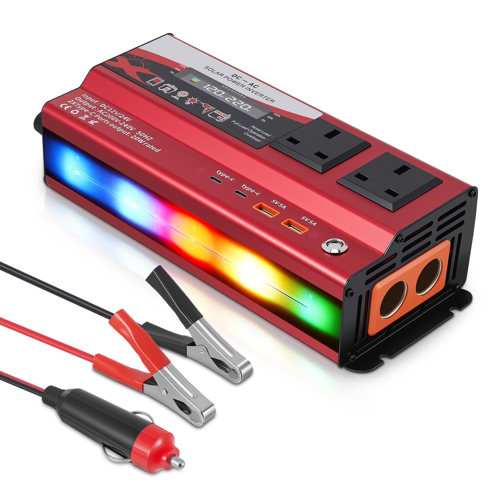 2000W Power Inverter 12V to 240V AC Car Converter, Car Power Inverter with 5A 2 Type-C+2 USB+2 AC Sockets, LED Scrolling Light & HD Digital Display, Inverter for Motorhomes Truck Boat Camping