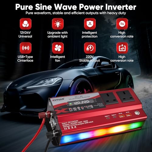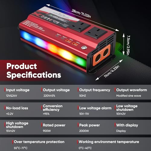 - 【Car Inverter】: Convert 24V DC to 240V household power supply and continuously output 2000W. It can convert 12V DC power in vehicles to 220V AC power, providing a stable and reliable power supply for your electronic devices, such as laptops, mobile phones, tablets and other power tools.