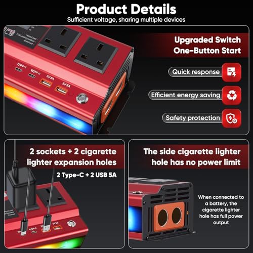 - 【High-Efficiency Interface】: Our vehicle-mounted inverter is designed with multiple interfaces, including 2 AC sockets, 2 Type-C ports 5A and 2 USB ports 5A, which can simultaneously supply power to various electronic devices. Whether you are on your way to work or traveling, you can enjoy convenient power support at any time.