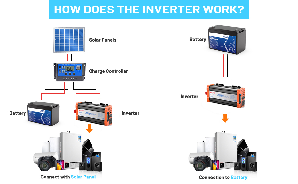 - 【12V to 240V Inverter】The 2000W inverter provides continuous DC to AC power (4000W peak), and the 230V/240V AC outlet can charge large devices such as laptops, cameras and tablets, and can connect home appliances. It is a good choice for must-have auto accessories. The inverter comes with a connecting cable and can be connected to almost any vehicle, making it ideal for holidays, road trips.