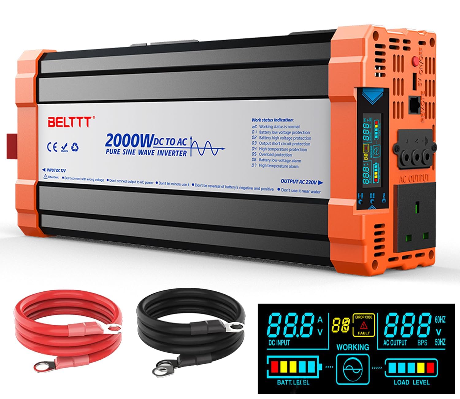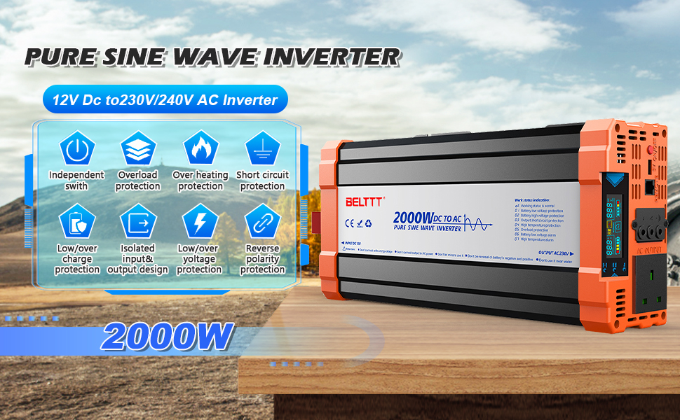 - 【2000W Pure Sine Wave Inverter】True 2000W Pure Sine Wave Converter, peak power 4000W, DC 12V input, AC 240V output; Compared with modified inverters, our 2000W Pure Sine Wave Inverter is able to generate cleaner, smoother, quieter, more reliable power supply, and provide greater drive capacity, better protect sensitive equipment, reduce noise and reduce power consumption