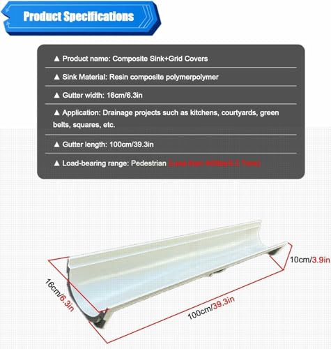 Introducing our high-quality drainage system, the ideal choice for your DIY garden and garage projects. This external drain cover is designed to effectively prevent leaves, branches, and debris from blocking your drainage system, ensuring optimal water flow and reducing the risk of clogs. Engineered for user-friendly installation and maintenance, our drainage grate is perfect for homeowners aiming to improve their outdoor environments. **Product Name:** External Drain Cover **Gutter Length Options:** 60 cm (23.6 inches), 100 cm (39.3 inches) **Gutter Width Options:** 11 cm (4.3 inches), 16 cm (6.3 inches), 21 cm (8.2 inches) **Gutter Height:** 10 cm (3.9 inches) **Load Capacity:** Supports pedestrian traffic (up to 440 lbs / 0.2 tons) **Key Benefits:** 1. Constructed from high-density, waterproof, and fire-resistant materials for durability. 2. Cold-resistant design ensures no deformation under extreme conditions. 3. Lightweight for easy installation and disassembly. 4. Slip-resistant surface for enhanced safety. 5. Customizable lengths to fit various installation requirements. 6. Protect your drainage system effectively with our channel drain grates. **Package Includes:** 1 trench cover **Tips:** → For any inquiries or issues with your order, please do not hesitate to reach out. → Minor variations may occur due to different batches and manual measurements; we appreciate your understanding. → All images are for reference; actual product appearance may vary. Upgrade your outdoor experience with our dependable drainage solution, designed to keep your spaces clean and functional!