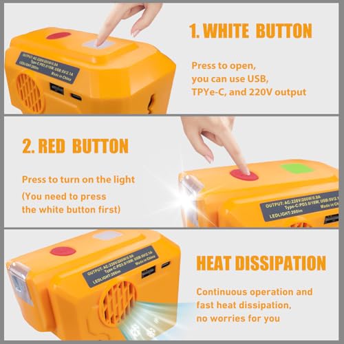 Highly compatible with 18V/20V batteries: Compatible with DCB204 DCB205 DCB206 DCB181 DCB182 DCB200 and other 18V lithium batteries, plug and play, providing a reliable wireless power solution for outdoor work or power outages. Safety and intelligent protection design: Built-in overvoltage protection, overcurrent protection, and cooling fan. The power button is equipped with a low voltage warning function to ensure device and user safety and avoid the risk of battery over-discharge or overheating.