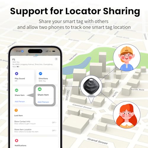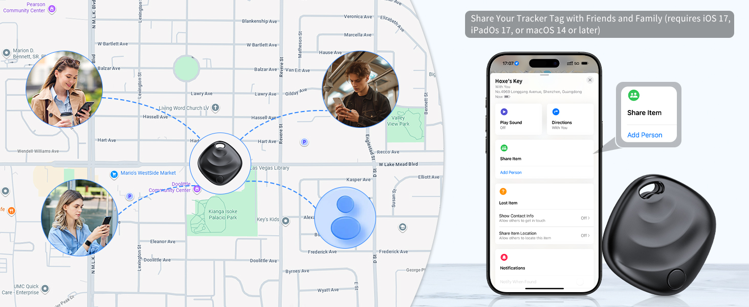 - 【SHARE WITH FRIENDS AND FAMILY】: New feature in iOS 17 – You can share this air tag tracker with up to 5 borrowers in the "Find My" app, and they can see the tracker tag location on a map, so items that everyone uses can be tracked by friends and family. Borrowers will not receive tracking notifications when the gps tracker moves with them. Please make sure your iOS device is updated to iOS 17/iPadOS 17/macOS 14 or above.