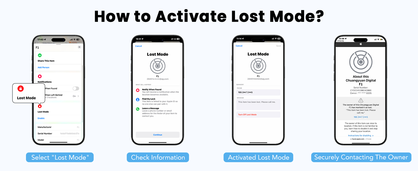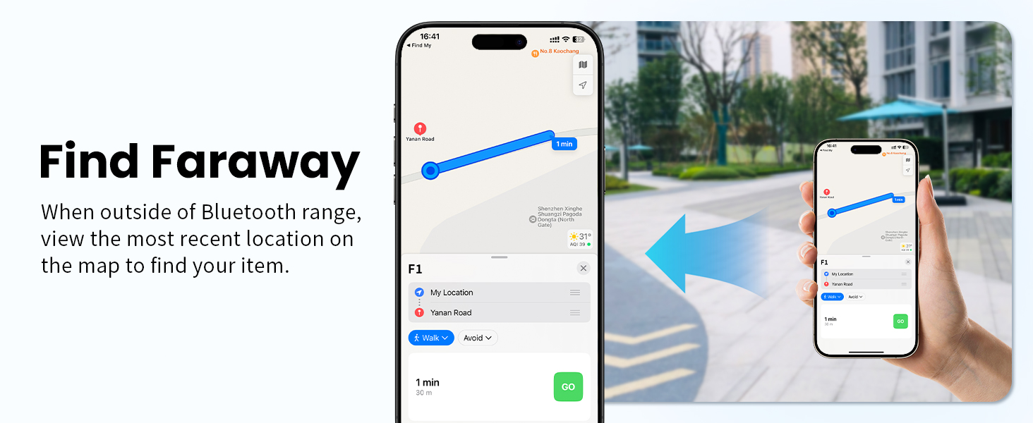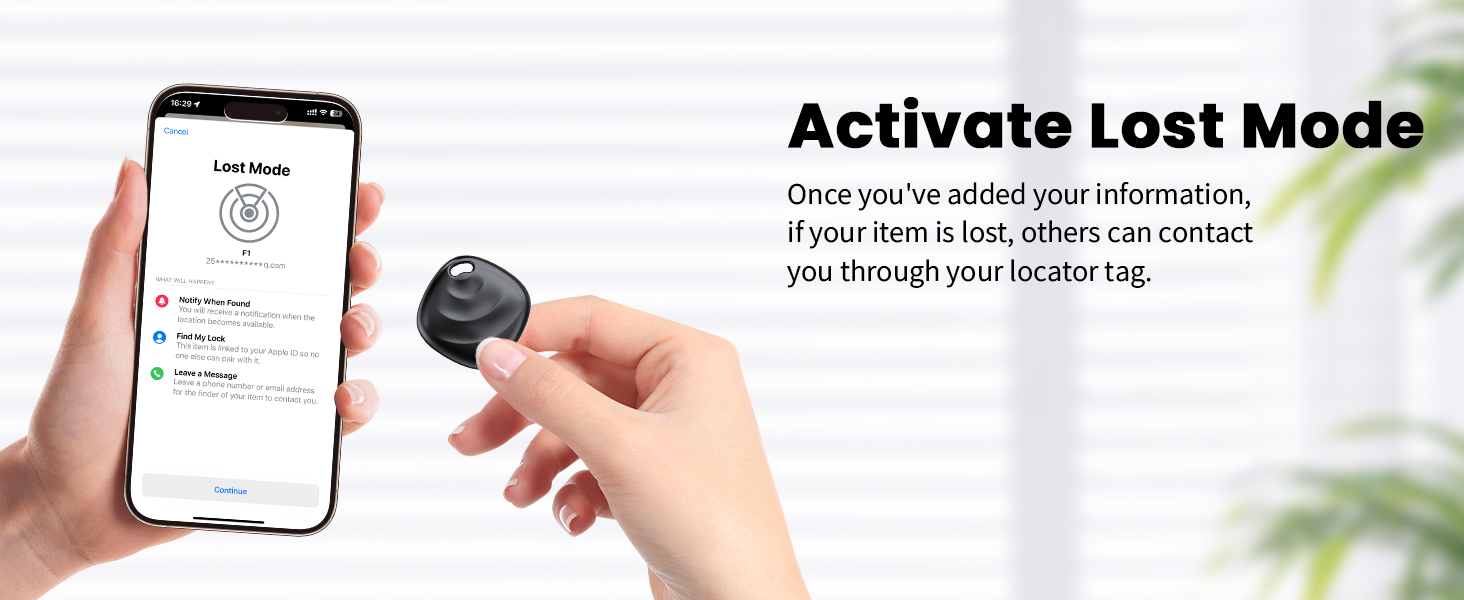 - 【LEFT BEHIND REMIND AND LOST MODE】: When the luggage tracker is out of Bluetooth range, your iOS devices will receive a notification with the last known location, you can view the most recent location on the "Find My" app. If you preset a "Lost Mode" and retain your contact information, the bluetooth tracker allows nearby Apple devices to access your contact information and remotely provide you with the location of the localizer.