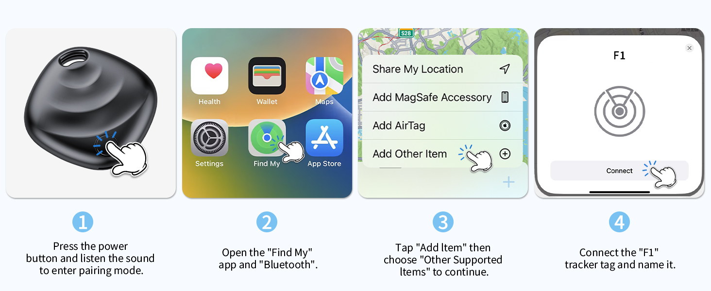 - 【HOW TO PAIRING YOUR GPS TRACKER TAG】: Press and hold the function button for 5 seconds to turn it on. Open the “Find My” app, select Items > Add New Item (+) > Add Other Item. When "F1" appears, tap to connect and set a custom name and icon for a simple and fast setup process.