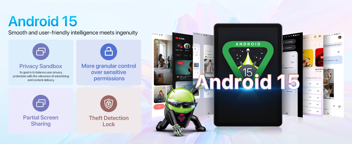 - 【Android 15 & Gemini AI, Easy-to-Use Tablet】T10 tablet, equipped with Android 15 and Gemini AI, revolutionises the everyday experience of entertainment and work: Gemini AI is an intelligent system that learns your usage habits, optimising performance in real time to deliver smooth, responsive operation, video viewing and other experiences. Enjoy advanced updates, enhanced security and an intuitive interface, making every interaction seamless.Perfect for multitasking and high-speed entertainment!