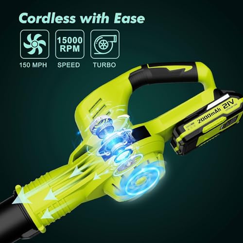 21V Cordless Leaf Blower, 150MPH High-Speed Cordless Leaf Blowers with 2 Speed Modes, Includes 2 x 2.0Ah Batteries & Fast Charger, Lightweight Electric Leaf blowers for Lawn Care & Yard