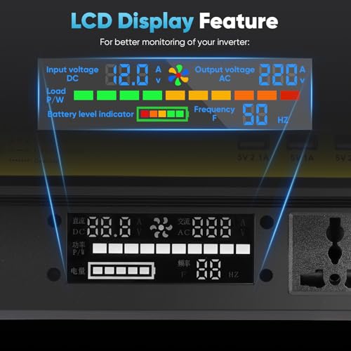 - 【Comprehensive LED Display】This 12V to 240V power inverter is equipped with a high-definition LCD screen, displaying real-time information including AC voltage, DC voltage, current power usage percentage, remaining battery capacity, and frequency. This allows you to monitor the inverter's operating status at a glance.