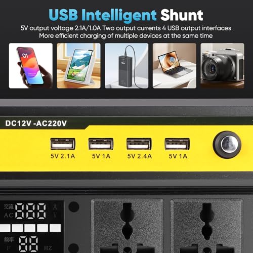 - 【8 Versatile Ports】Our power inverter features 8 diverse ports, including 4 USB ports, 2 UK-standard sockets, and 2 cigarette lighter sockets. The USB ports comprise 2x 5V/2.1A ports, 1x 5V/2.4A port, and 1x 5V/2.1A port, accommodating various electronic devices.