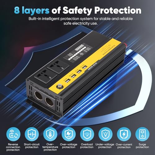 - 【8-Layer Protection System】This car power inverter features comprehensive protection including reverse polarity, short circuit, over-temperature, over-voltage, overload, under-voltage, over-current, and impact resistance. The premium aluminium alloy casing provides excellent durability against drops and impacts.