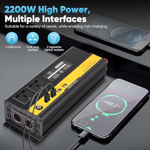 2200W Power Inverter DC 12V to AC 240V,Aluminum Car Inverter with 4 USB,2 UK Socket & 2 Cigarette Interface,Car Adapter with LED Display,Smart Cooling Fan & 8-tier Safety Protection for Travel