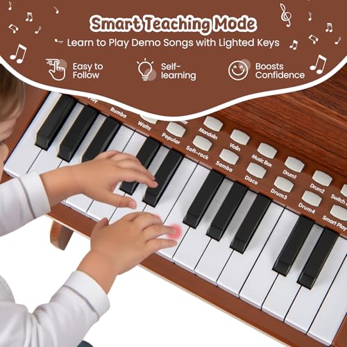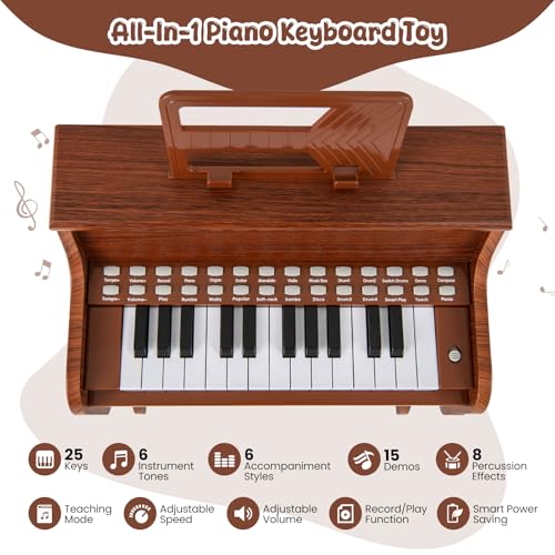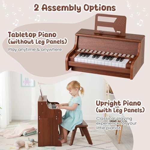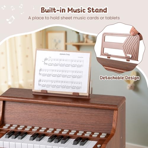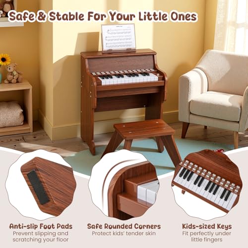 25 Key Kids Piano and Stool, Wooden Toddler Electronic Keyboard with Music Stand, Record/Play Function, Teaching Mode, Educational Music Instrument Toy Piano Keyboard for 3+ Boys Girls (Brown)