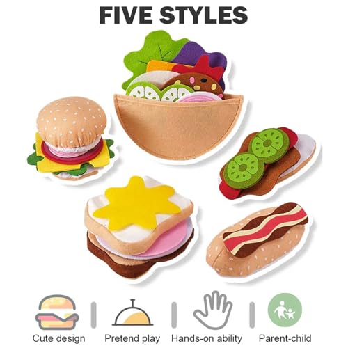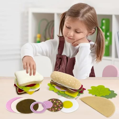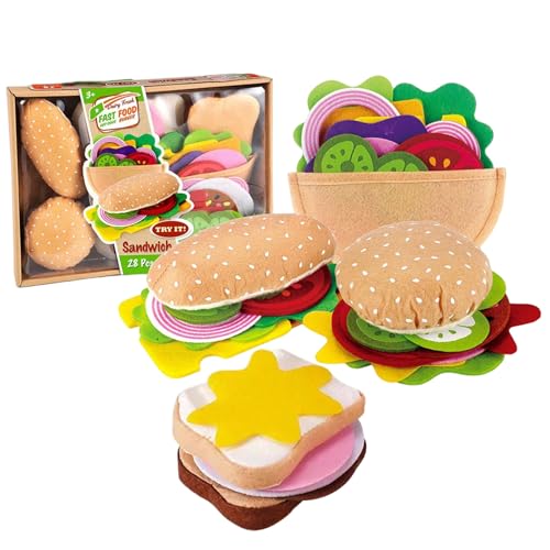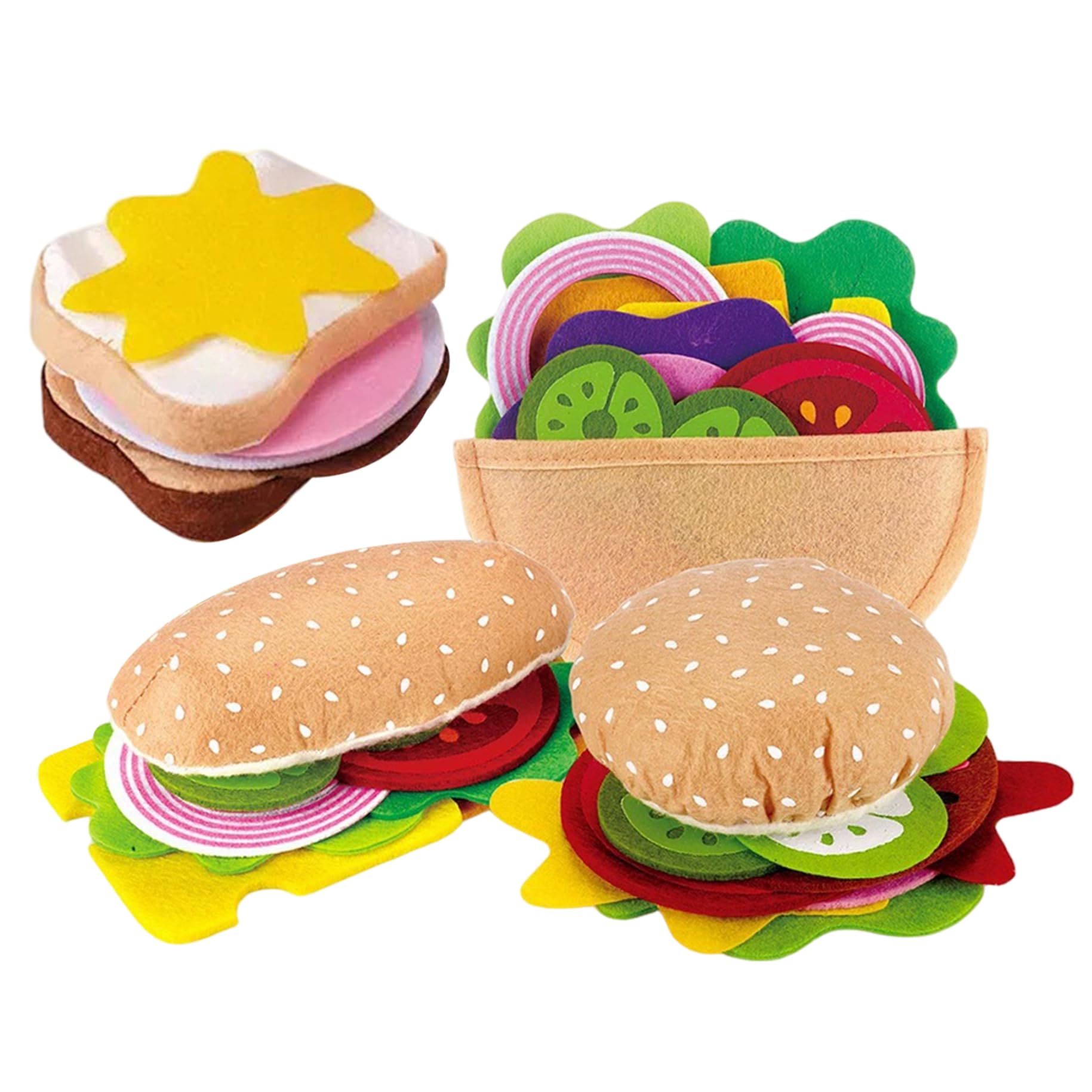 - Realistic Felt Food: Crafted with soft, felt material, this 28PCS play food set features detailed hamburger, beef steak, vegetable, and sandwich pieces that engage kids in imaginative kitchen play