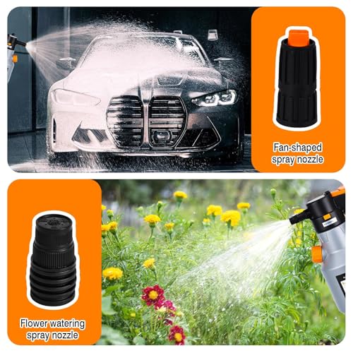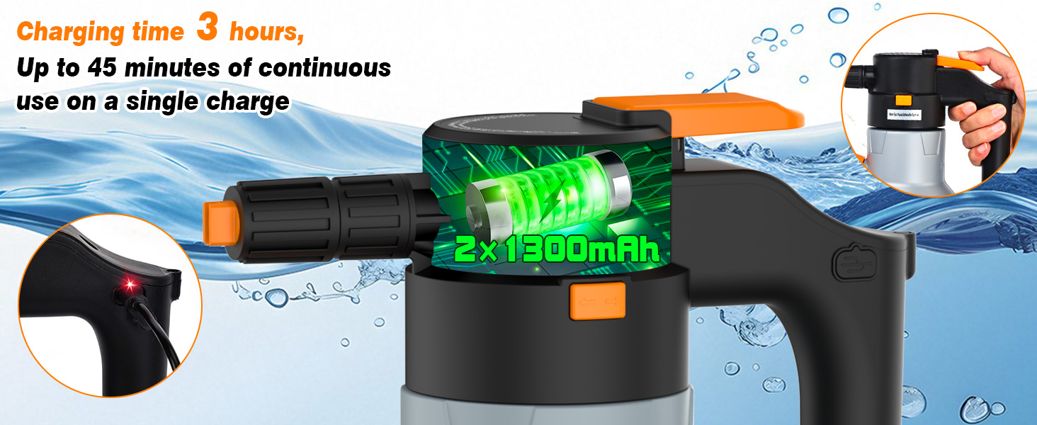 - 45 MINUTES LONG RUNNING LIFE: The pressure sprayer is powered by 2*1300mAh powerful batteries, it takes 3 hours to charge (the indicator light turns from red to green to indicate it is full), and it can work continuously for up to 45 minutes on a single charge. The motor can provide power immediately, just press the water dispensing button to automatically pressurise, providing easy and efficient work for your car cleaning and gardening spraying