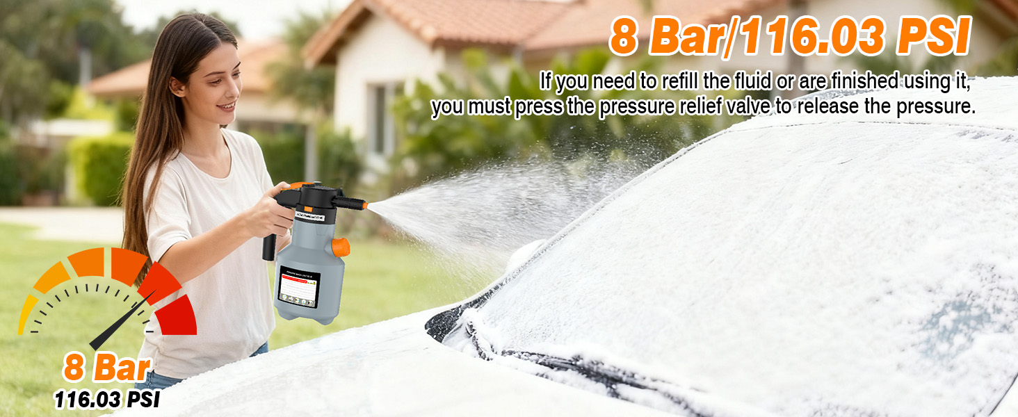 - SAVE 3 TIMES POWER: 8BAR electric pressure booster says goodbye to hand soreness, the spray can automatically build pressure, a key to release dense foam, so that the spray is more powerful, wider coverage; car wash/watering/cleaning the wall without repeated pressure, cleaning SUV cars also without pressure
