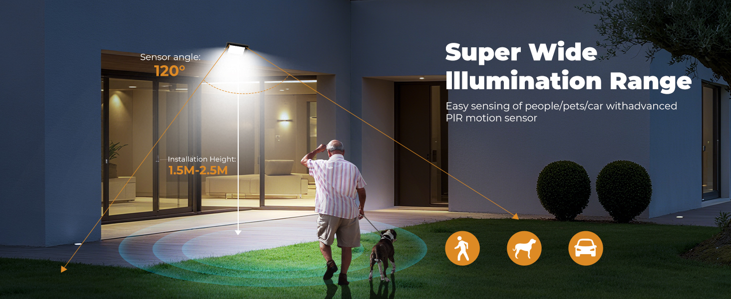 【Energy Efficient】The sensor of this outdoor security lights features an advanced convex design, with a 120° wide detection angle and 36 high-quality LED bulbs. It significantly reduces energy consumption while providing brighter illumination and a wider lighting range