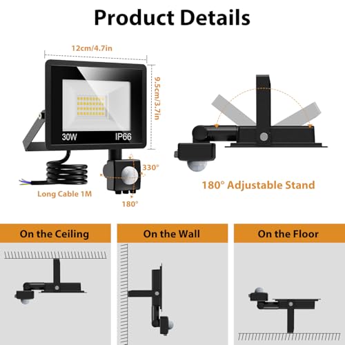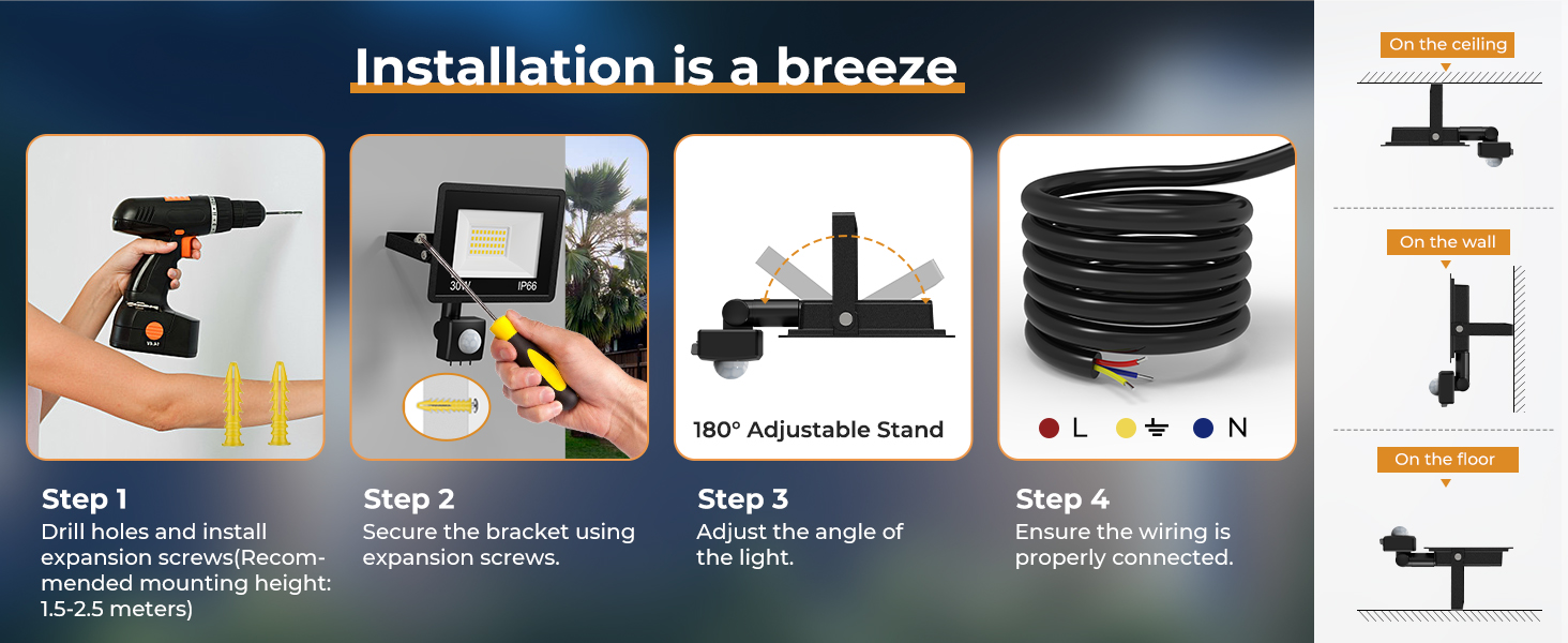 【Easy and Flexible Installation】This motion sensor lights outdoor comes with included screw accessories and an adjustable bracket, allowing easy mounting on ceilings, walls, or the ground. Simply attach the bracket to the pre-prepared mounting holes and secure the unit with screws(1M cable included)