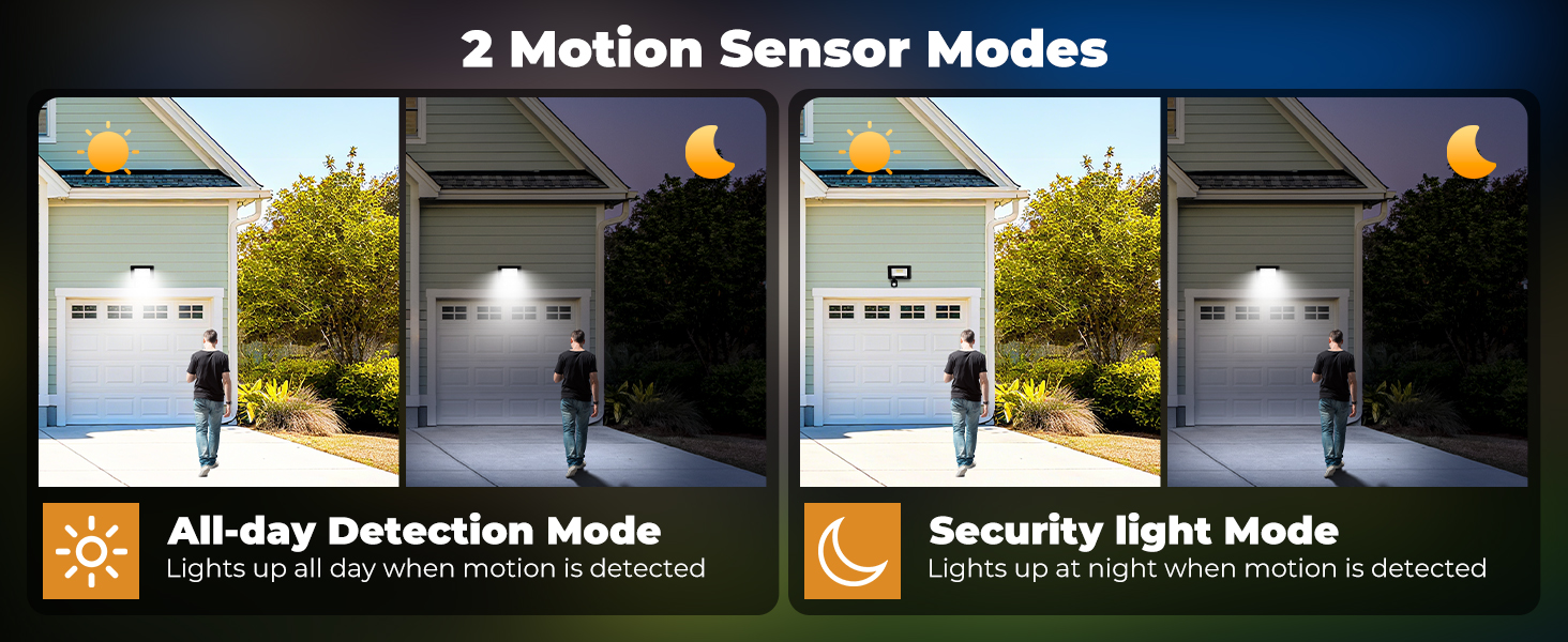 【2 Mode Motion Sensor】Equipped with a smart PIR sensor, this led floodlight offers two practical operating modes: all-day sensing or night-only operation. You can easily select the desired mode to balance convenience and energy efficiency