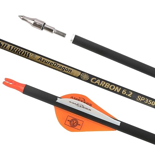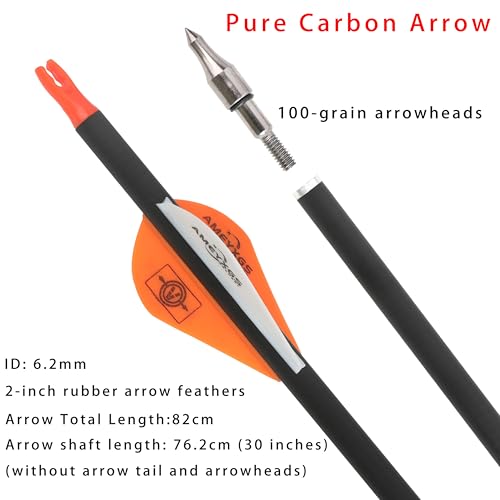 【Material】pure carbon arrows, not easy to bend and break, light weight, easy to be accelerated by the Draw Weight of the bow, the molecular structure of carbon fiber is stable and not easy to be damaged. Also comes with 2 inch rubber feathers.