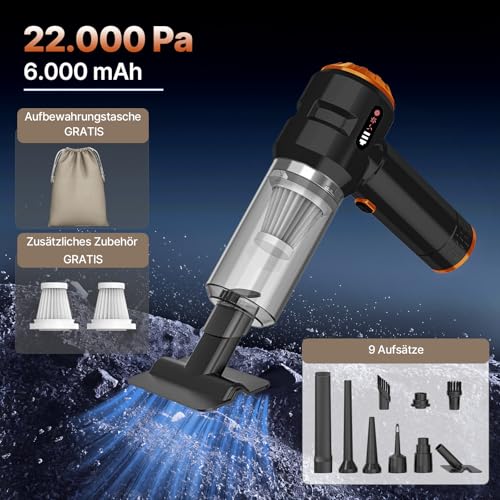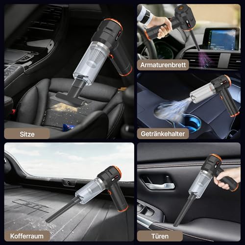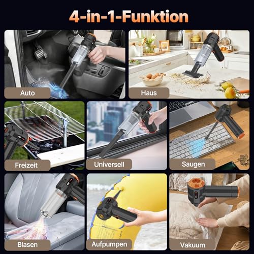 【4-in-1 Multifunction:Vacuum/Blow/Inflate/Vacuum】 4-in-1 wireless car vacuum cleaner combined: Vacuum: 22000Pa for pet hair in car seats Bubbles: cleaning kitchen corners Inflating: air mattresses in 90 seconds Vacuuming: vacuum packaging for travel luggage