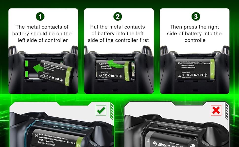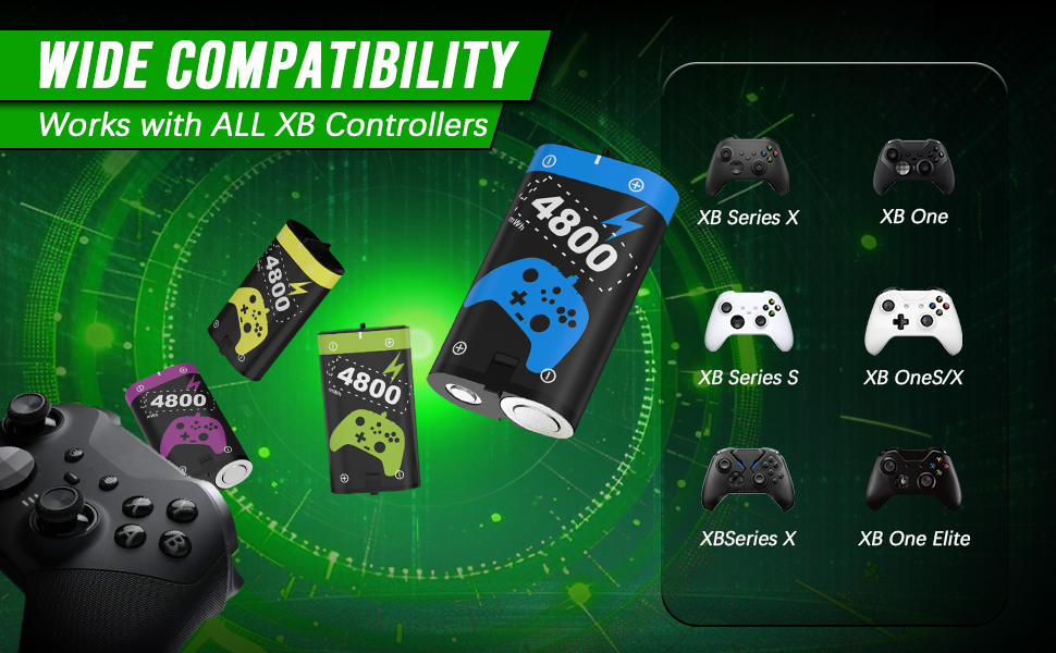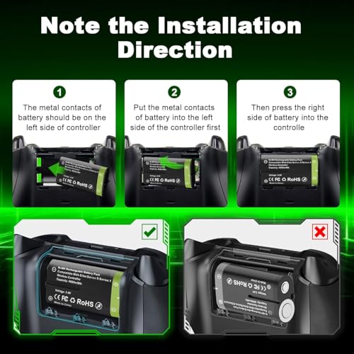 - 【EASY TO USE】Therechargeable xbox battery pack is compatible with Xbox Series X|S/ One/ One S/ One X/ One Elite controllers, controllers won't run out of power with 4 Xbox One battery packs.The Xbox Battery Charging Dock is lightweight and compact, easy to store or carry around, solving the embarrassing situation of running out of battery on the go. The Xbox Series X Controller Battery Pack is durable and easily mounts to your controller. Please note: Insert the batteries in the correct orientation.
