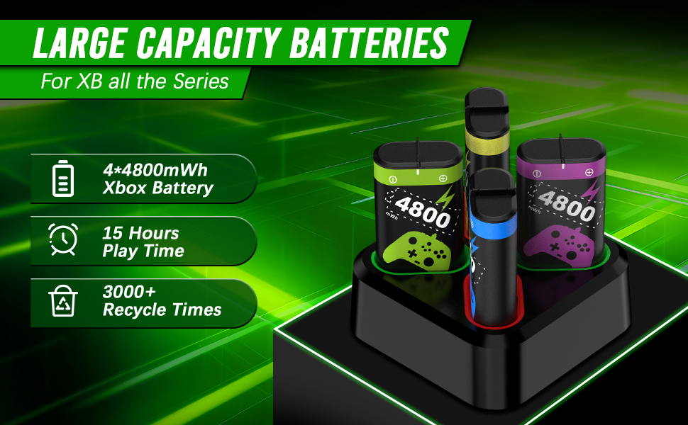 - 【4 Xbox Rechargeable Batteries】4 x 4800mWh Xbox one controller rechargeable battery packs ensure you'll never have to worry about your controller running out of power again.Each battery can be recharged up to 3000 times, the rechargeable battery pack is compatible with Xbox Series X|S/ Xbox One/ Xbox One S / Xbox One X/ Xbox One Elite controller.
