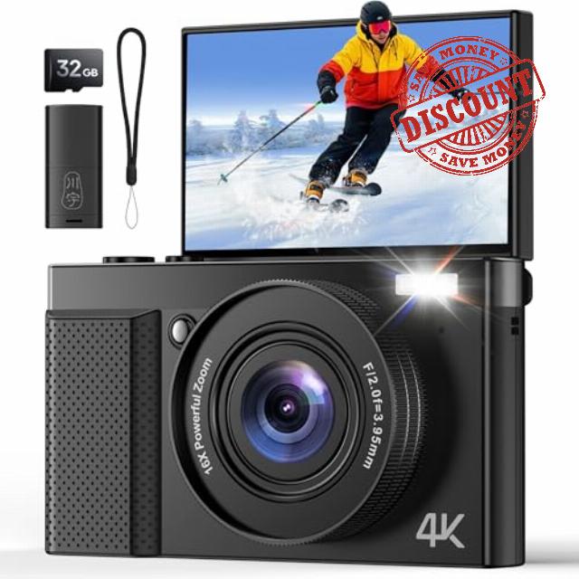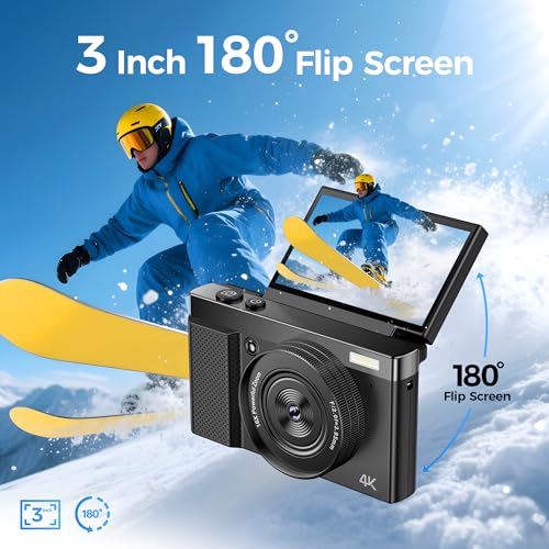 4K Digital Camera for Photography Vlogging: 64MP Cam for YouTube with 3″ 180° Flip Screen – 16X Digital Zoom Point and Shoot Camara with 32GB Micro SD Card for Kids Teens Beginners