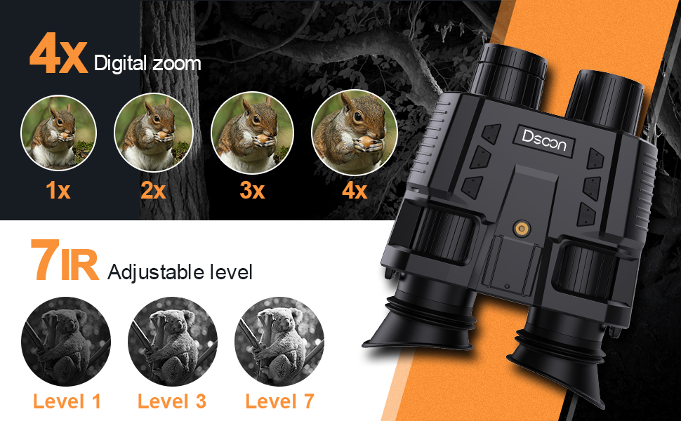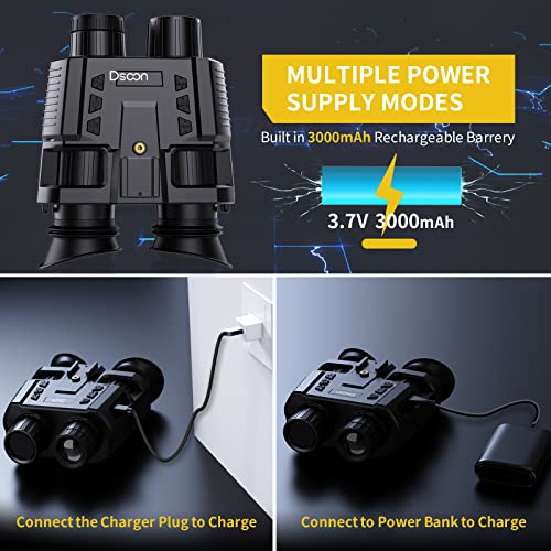 - [Long /Short Range]: Dsoon 4k Night vision goggles 8x digital zoom and a Wide Field of View (FOV) of 10° are critical for far/close-quarters use. 850nm IR LEDs are designed to illuminate everything nearby. The display design of the binoculars allows you to experience the 3D real-time observation effect in an immersive, recording of audio and video.