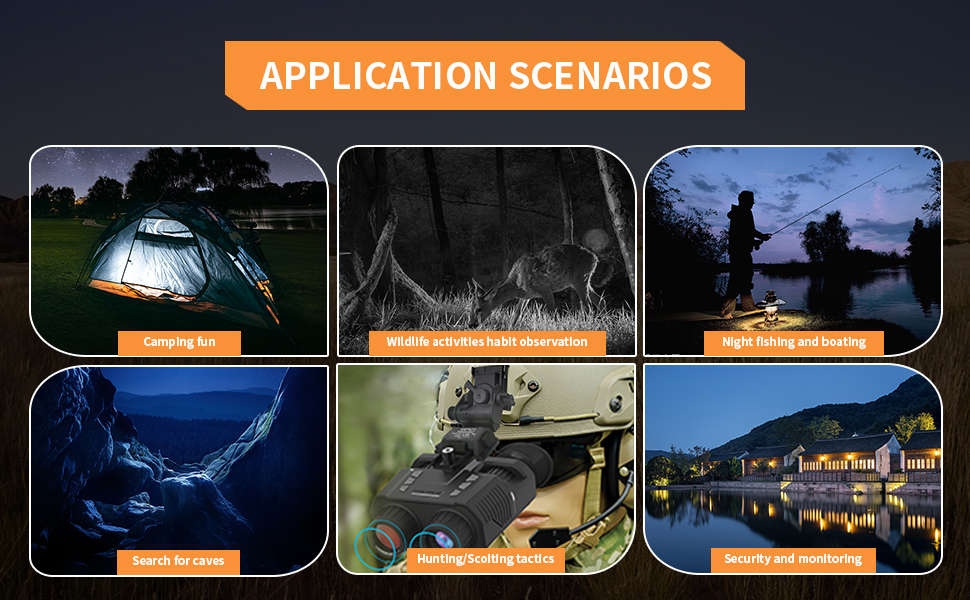 - [Clearly Sen in 10% Darkness]: The Helmet Night Vision Binoculars feature a No-Glow INFRARED ILLUMINATOR. High-definition images with 2048×1536 pixels, 1920×1080@ 30FPS video. The body's unique non-slip and 6-button design is easy to use. Thanks to our powerful 850 NM infrared illuminator, you can hunt, monitor wildlife, explore the wilderness, or protect your farm during a pitch-dark night – NO external light needed!