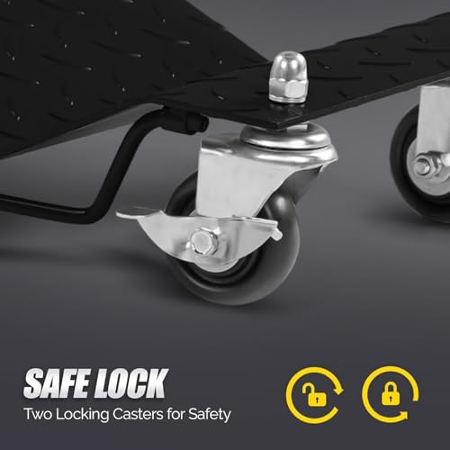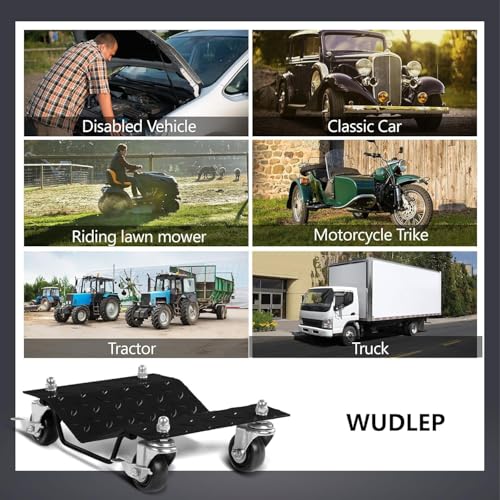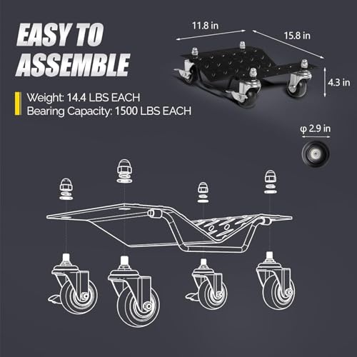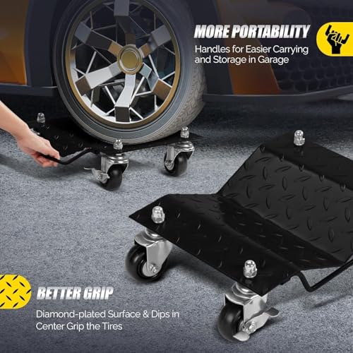 - 【Industrial-Grade Heavy-Duty Load Capacity】 Built from rugged reinforced steel plate, this set of four dollies supports a total weight of 6,000 lbs (1,500 lbs per dolly)—ideal for effortlessly repositioning vehicles in garages or storage spaces.