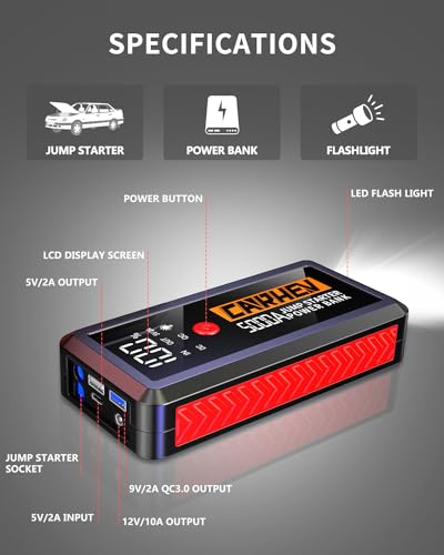 - 【MORE THAN A JUMP STARTER】The CARHEV also serves as a portable 26800mAh power bank with 2 USB Outputs (9V/2A and 5V/2A), Effortlessly power your favorite USB-C devices, like phones, tablets, laptops, wearables, and Built-in LED flashlights with 3 modes Flash/Strobe/SOS, In addition, with a 12V/10A port, the jump box can even power 12V DC equipment such as tire inflators and car vacuums.