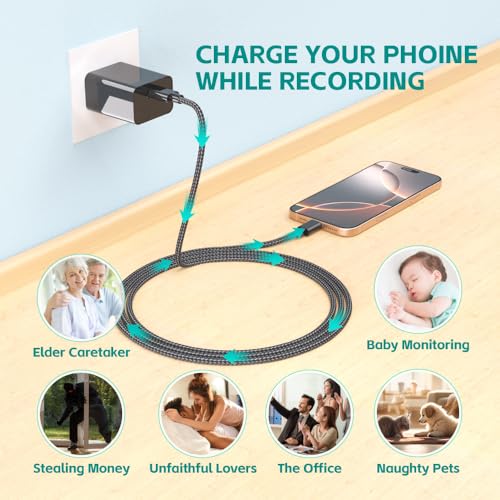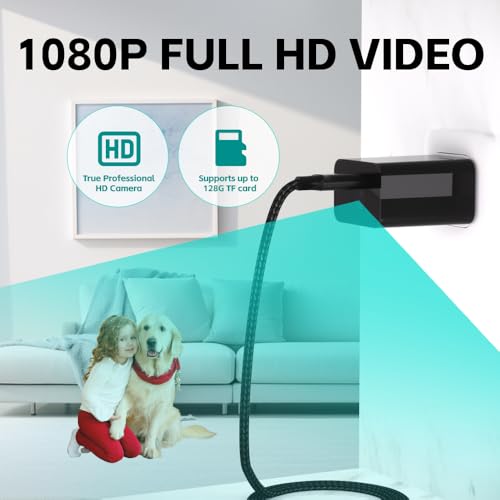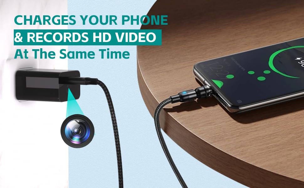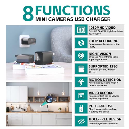 - 2-in-1 USB Charger Camera: Seamlessly integrates a fast-charging USB phone charger with a mini full-hd camera for dual functionality. Support 32GB, 64GB, 128GB Micro SD card (included 64G SD card)