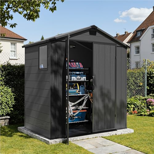 Transform your outdoor space with the Triumphkey 6×4 ft Resin Storage Shed. This generously sized shed is the perfect solution for a clutter-free garden, patio, or backyard, effortlessly storing everything from gardening tools and lawnmowers to bicycles, ladders, and shelving units.