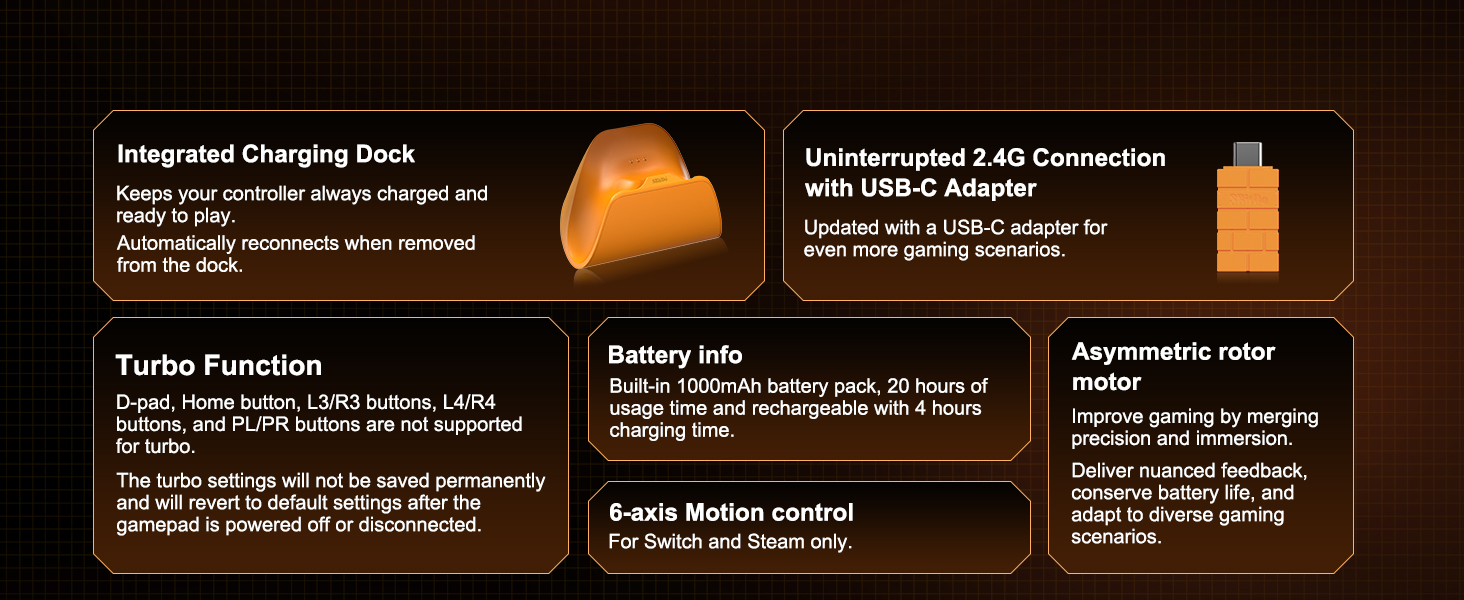 - All-in-One Charging Dock & Storage Hub – The integrated dock not only keeps your controller fully charged but also stores the spare A-B-X-Y buttons, magnetic retrieval tool, and the 2.4G adapter in a dedicated compartment, ensuring they are always organized.