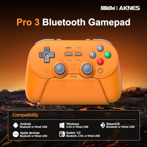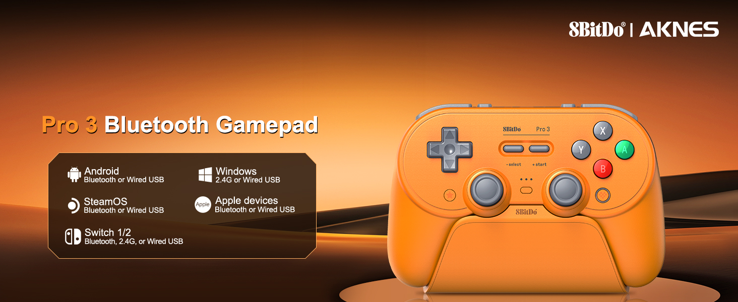 | Package Contents | 8BitDo Pro 3 Bluetooth Gamepad, Charging dock, 2.4G adapter, USB cable(1 meter), ABXY button puller, Ball-top joystick caps x 2, Instruction manual |