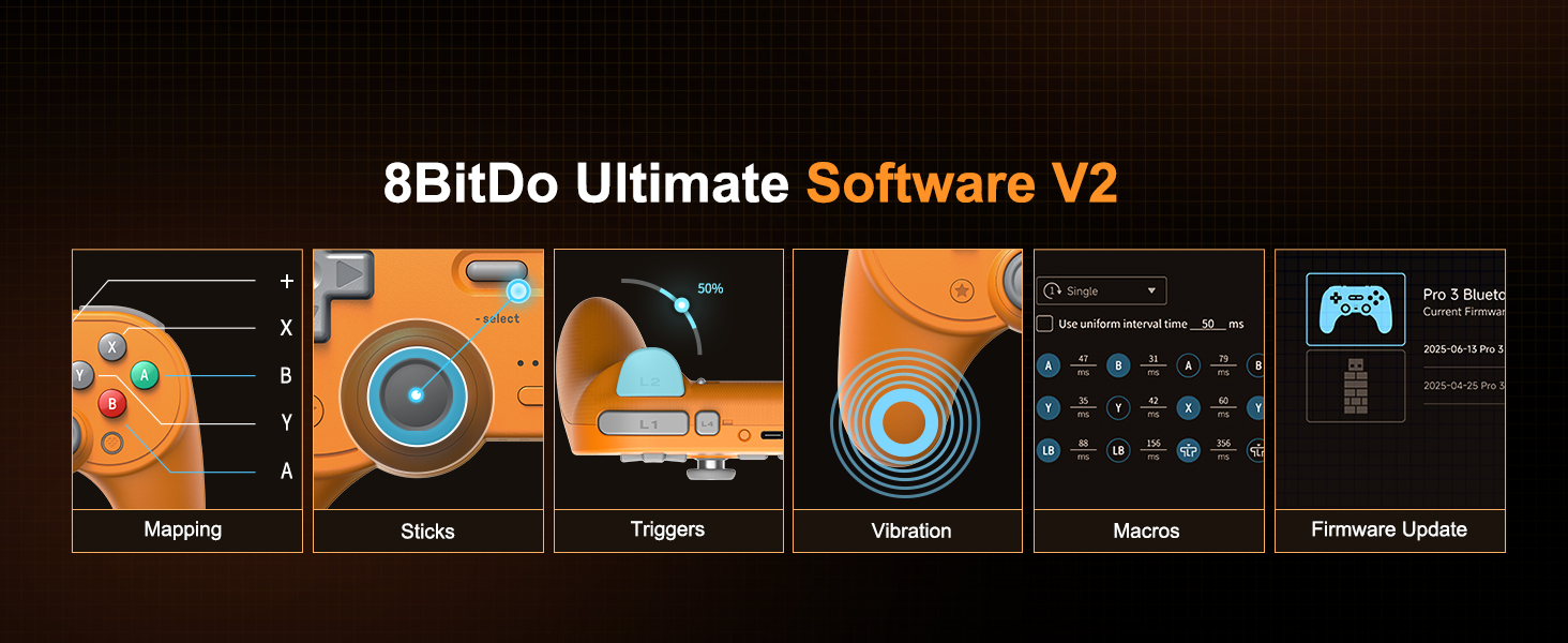 - Enhanced Gameplay Features – Asymmetric rotor motor vibration & motion controls (for Switch/Steam only), turbo function, 8BitDo Ultimate Software V2 support.