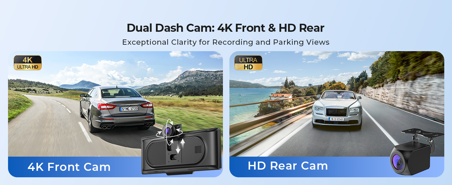 - 4K Front + HD Rear Dual Dash Cam: Equipped with 4K front and waterproof HD rear camera. Split-screen shows front and rear views simultaneously. Front cam adjusts up, down, left, right for a wider, clearer view. Rear cam records and assists reversing for safety. Loop recording auto-overwrites old footage to prevent storage full. Includes 64GB memory card.It supports up to 256GB