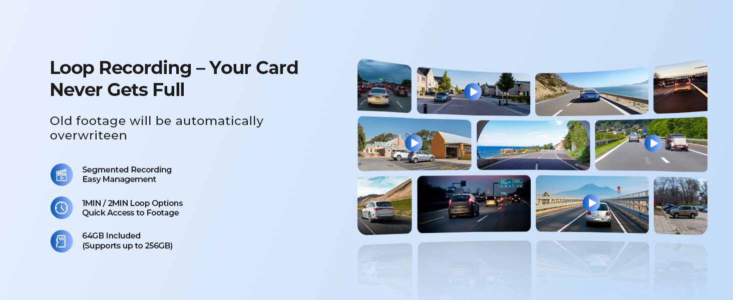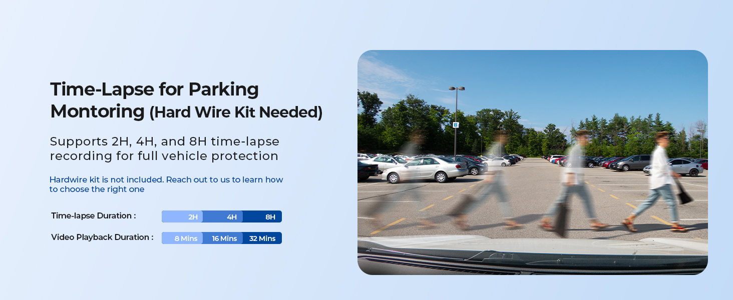 - Time-Lapse for Parking Monitoring (Hard Wire Kit Needed)When the engine is off, it offers 2H, 4H, or 8H time-lapse recording. This helps monitor the surroundings and capture any unusual activity while your car is parked.With concise time-lapse playback, you can quickly review key moments and never miss important details. Please note, parking monitoring requires a hard wire kit, which is not included the package.You can reach out to us for guidance on selecting hard wire kits with the right specifications
