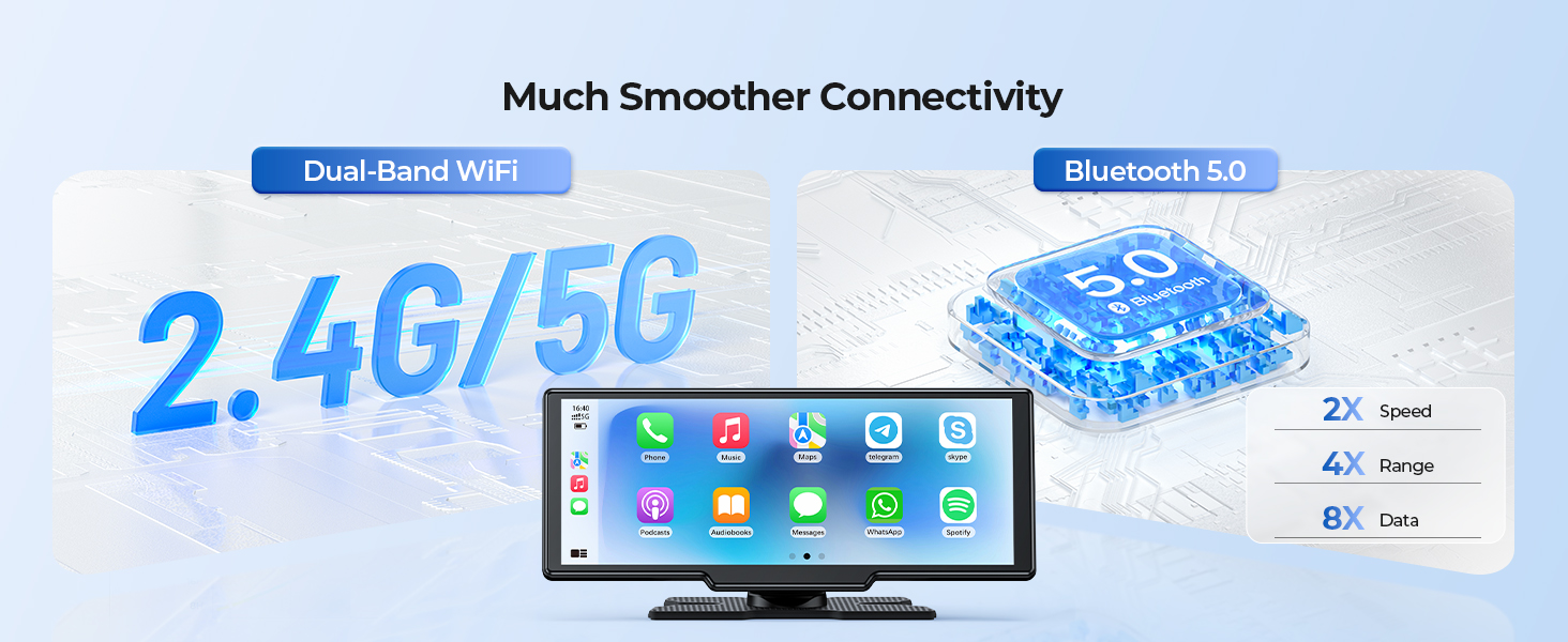 - Enhanced Responsiveness: Powered by 5G Wi-Fi, Bluetooth 5.0, and an advanced industry-grade chip, the screen delivers 1.35× smoother performance than similar products. Touch commands respond 25% faster, ensuring a highly responsive experience—especially when using CarPlay or Android Auto