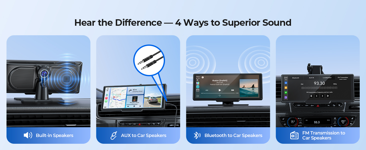 - 4 Audio Output Modes & Steering Wheel Control: Connect via CarPlay or Android Auto and enjoy audio through your car speakers via Bluetooth, AUX, or FM. With multifunction steering wheel controls, you can easily change tracks, adjust volume, or take calls without distraction